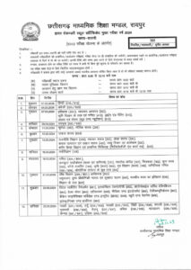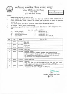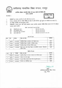 छत्तीसगढ़ माध्यमिक शिक्षा मण्डल द्वारा जारी टाईम टेबल के अनुसार 12वीं की परीक्षा 01 मार्च से शुरू होकर 23 मार्च तक होगी, जबकि हाई स्कूल कक्षा 10वीं की परीक्षा 02 मार्च से 21 मार्च तक होंगी। इसी प्रकार शारीरिक प्रशिक्षण पत्रोपाधि (प्रथम एवं द्वितीय वर्ष) की परीक्षाएं भी 01 मार्च से 12 मार्च तक होंगी।
