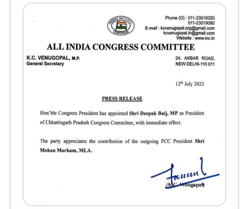 Breaking: मोहन मरकाम की छुट्टी, सांसद दीपक बैज बने प्रदेश कांग्रेस के नए अध्यक्ष, मुख्यमंत्री बघेल ने दी बधाई…