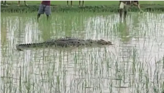बिलासपुर: रतनपुर राम टेकरी के पास स्थित बिकमा तालाब के बाजू में स्थित खेत में ग्रामीणों ने विशालकाय मगरमच्छ को देखते ही मोहल्ले में बात फैल गई। लोग घरों से खेतों की ओर दौड़ने लगे। पूरी तरह वयस्क यह मगरमच्छ करीब 9 फीट लंबा था, उम्र तकरीबन 10 से 12 साल बताई जा रही है।