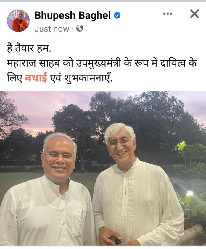 रायपुर: छत्तीसगढ़ के स्वास्थ्य मंत्री टीएस सिंह देव अब छत्तीसगढ़ के नए उप-मुख्यमंत्री बनाए जाने की घोषणा की गई है। आपको बता दें कि छत्तीसगढ़ में साल 2019 से जब से कांग्रेस की सरकार बनी थी तब से मुख्यमंत्री के चेहरे को लेकर भूपेश बघेल और टीएस सिंहदेव के बीच काफी मतभेद देखने मिले थे। और आज दिल्ली में कांग्रेस के वरिष्ठ नेताओं के बीच भी इस मुद्दे पर कई घंटे तक चर्चा चली। इस बार टीएस सिंहदेव को छत्तीसगढ़ का उप मुख्यमंत्री बना दिया गया है। राजनीतिक गलियारों में अब छत्तीसगढ़ की राजनीति को लेकर शांति का वातावरण बनाने हेतु आलाकमान ने टीएस बाबा को उप मुख्यमंत्री बनाकर एक नए अध्याय की शुरुआत कर दी है। इसी क्रम में कुमारी शैलेजा छत्तसीगढ़ कांग्रेस प्रभारी ने सभी पक्षों को एक करने के लिए जो अभियान चलाया था उसमें सफलता पा ली है और उन्होंने कहा है कि सभी लोग मिलकर आराम से चुनाव लड़ेंगे। कांग्रेस ने टीएस बाबा को उप मुख्यमंत्री बनाकर राजनीती का बहुत बड़ा दांव मास्टर स्ट्रोक के रूप में खेला है।