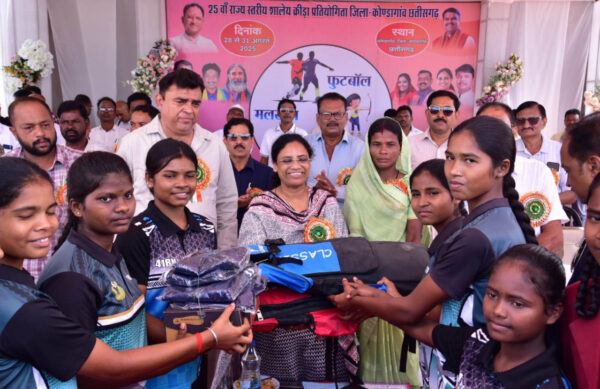 रायपुर, 28 अगस्त 2025 : बस्तर विकास प्राधिकरण की उपाध्यक्ष एवं कोंडागांव विधायक लता उसेंडी ने आज गुरूवार को जिला मुख्यालय कोण्डागांव के विकास नगर स्टेडियम में 25वीं राज्य स्तरीय शालेय क्रीड़ा प्रतियोगिता का शुभारंभ किया। यह प्रतियोगिता 28 अगस्त से 31 अगस्त 2025 तक चलगी, जिसमें राज्य के रायपुर, बस्तर, दुर्ग, बिलासपुर और सरगुजा संभाग के लगभग 570 खिलाड़ी फुटबाल, तीरंदाजी और मलखंभ खेलों में अपनी प्रतिभा दिखाएंगे। इस दौरान खिलाड़ियों द्वारा आकर्षक मार्च पास्ट किया गया।